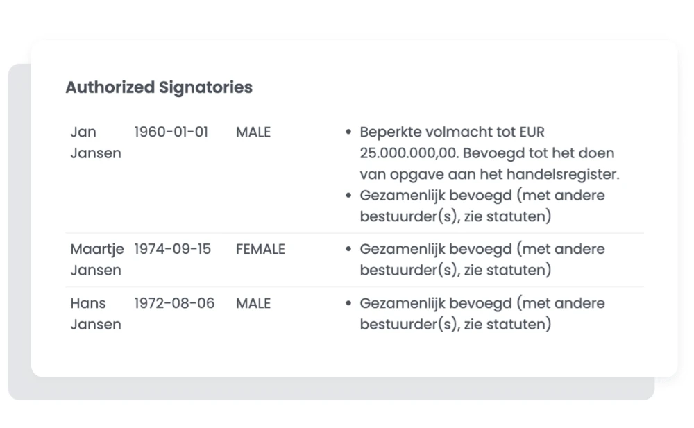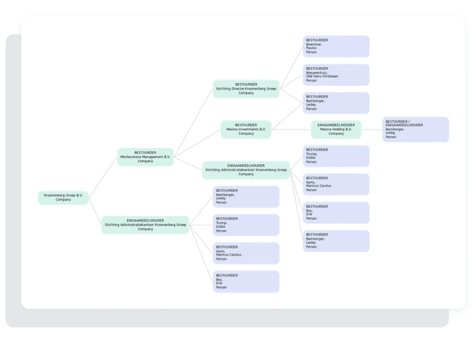 Het automatisch opgestelde organogram toont je alle Nederlandse organisaties en (buitenlandse) bestuurders of (buitenlandse) enigaandeelhouders. Zo zie je precies hoe de eigendoms- en zeggenschapsstructuur van de klant in elkaar zit.