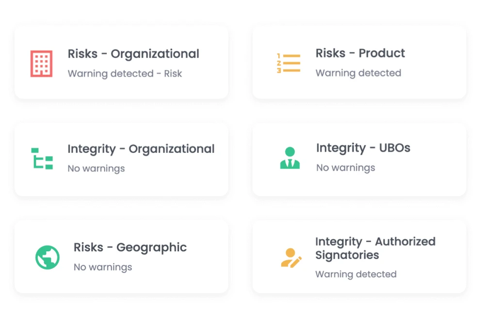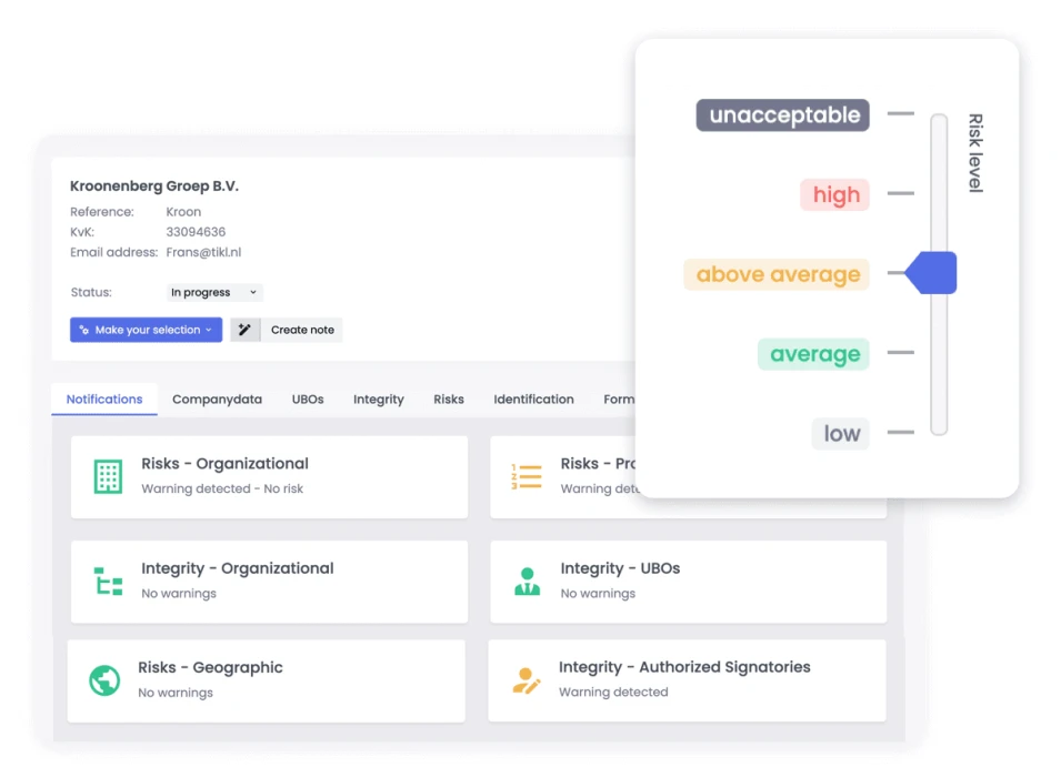 Sluit bedreigingen uit doordat je automatisch inzicht hebt waar de mogelijke product-, geografische, integriteits- en organisatiesrisicoās bij jouw klanten liggen. Beoordeel deze en mitigeer de risico’s.