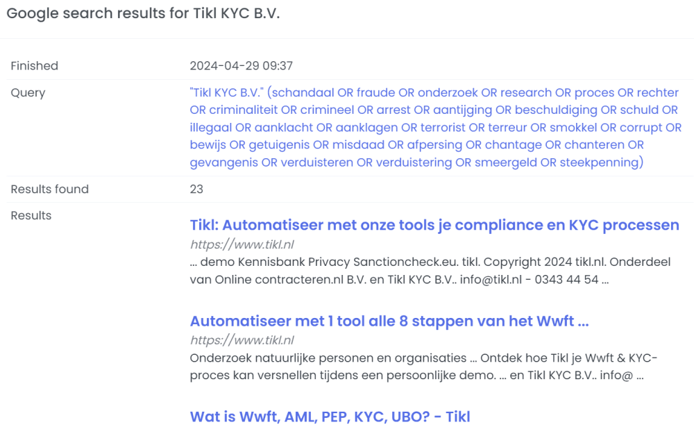 Personen en organisaties worden gescand op PEP, sanctie en adverse media risico’s. Hierbij worden hits getoond die voor 100% matchen en hits die bijna matchen. Bij beide hits moet de gebruiker in de tool beoordelen of daadwerkelijk sprake is van een hit.