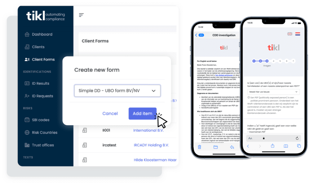 Continu houdt Tikl nieuwe wet- en regelgeving bij rondom de Wwft-cliƫntenonderzoeken. Waar nodig passen wij de tool hierop aan.