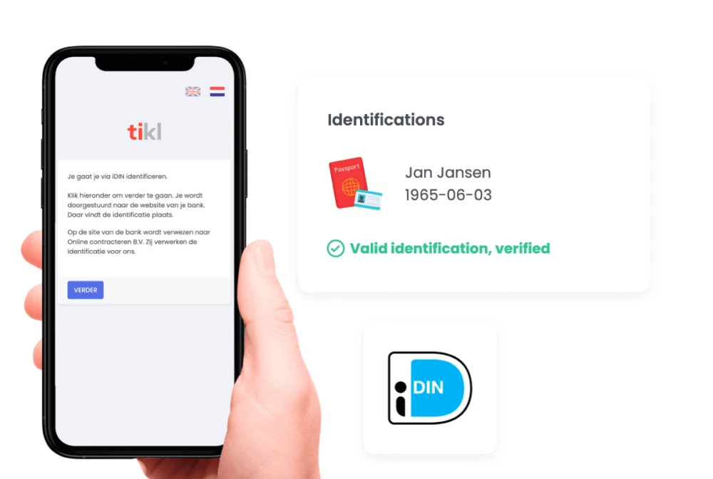 Verstuur vanuit jouw mailadres automatisch een identificatieverzoek naar de UBO’s, tekenbevoegden of particulieren. Jouw klant identificeert zich met iDIN of een Paspoort/ID-scan binnen 2 minuten.