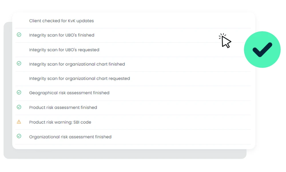 Is een UBO een PEP geworden of is de organisatie failliet? De KvK-wijzigen worden automatisch aangegeven in het dossier. Zo kan je event-driven herbeoordelen en bespaar je tijd.
